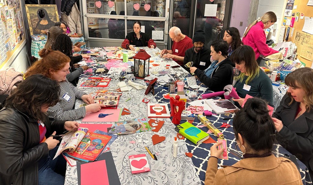 Rather than purchasing expensive gifts, participants were invited to craft collages and cards using donated items from Goodwill, newspapers and other reusable materials. The two-hour event commenced at 6 p.m., with attendees congregating around the large worktable in the artist lounge to socialize and create heartfelt Valentine’s Day gifts.