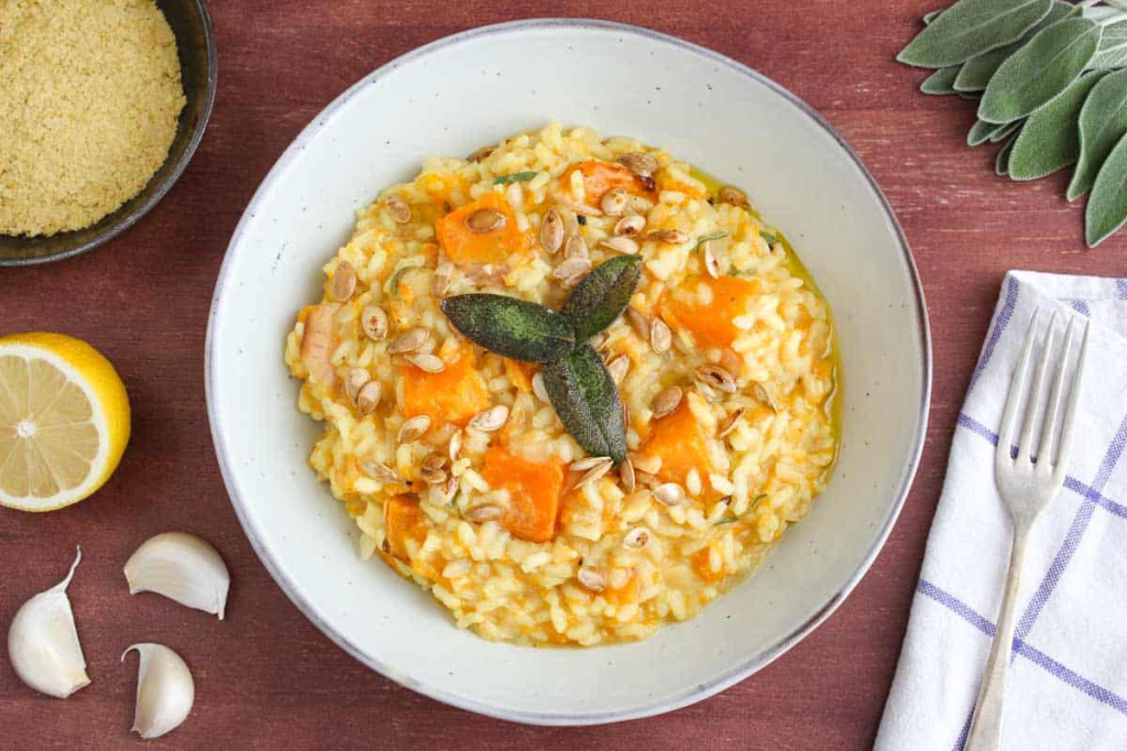 - Stir in the blended squash mixture to the risotto by large spoonfuls until the risotto is coated and flavored to your preference.